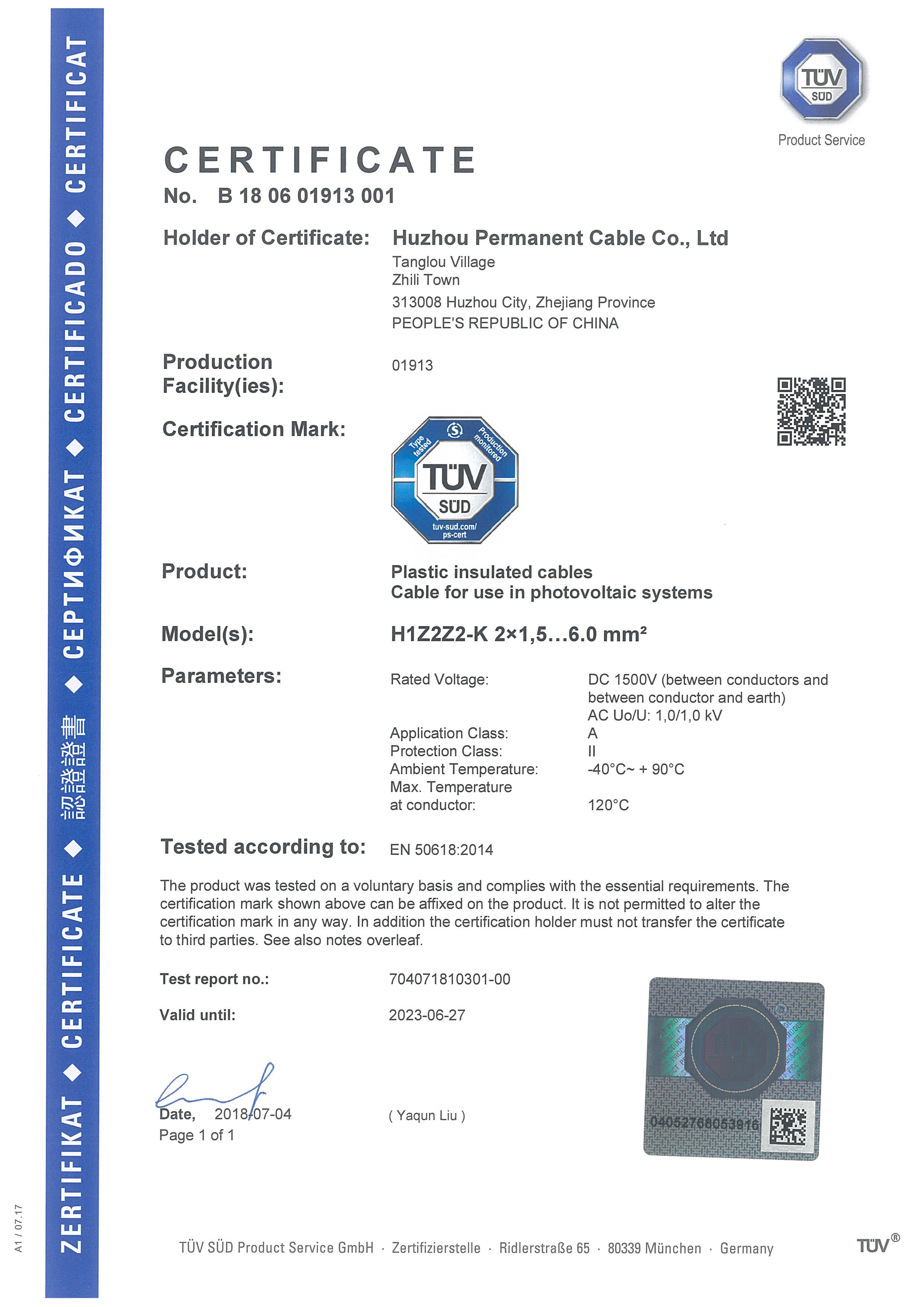2016年--2018年,我司先后獲得了CE證書和TUV證書, 通過了SGS的第三方驗廠。2017年-2018年,2年的時間內(nèi),在新能源領域--光伏電纜, 取得了重大進步。